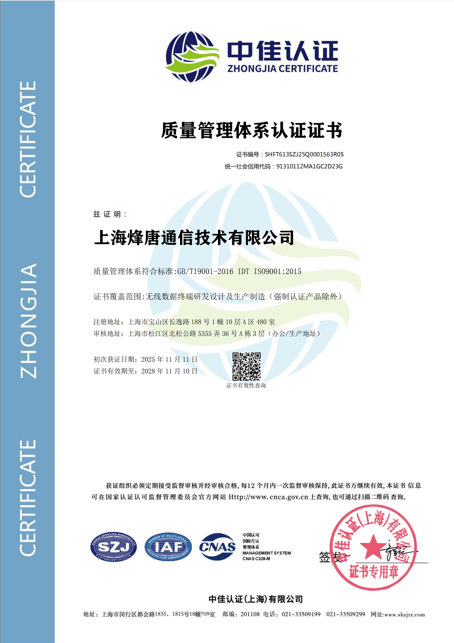 2025 年 11 月 11 日,上海烽唐通信技术有限公司顺利通过权威审核,正式获得覆盖无线数据终端研发设计及生产制造全环节的 ISO 9001 质量管理体系认证证书。这一认证标志着公司在 3000 平米智能化厂房的运营基础上,实现了核心业务的质量管理标准化升级,为产品品质与市场竞争力注入强劲背书。