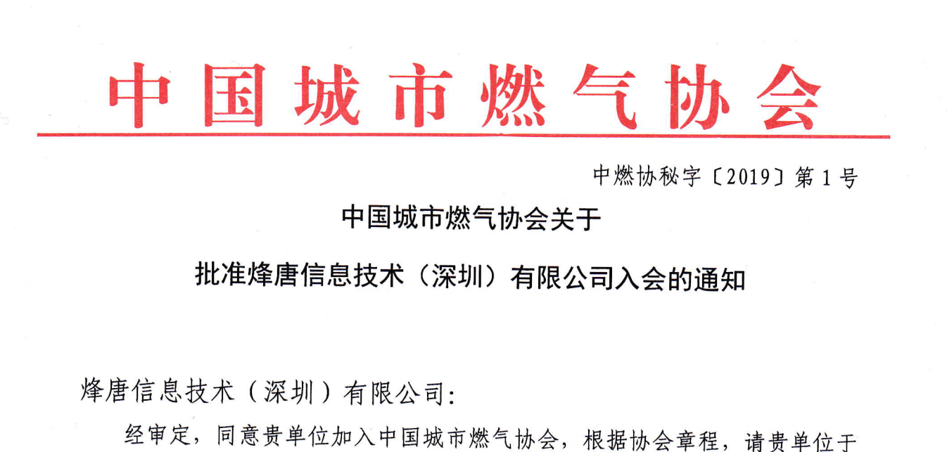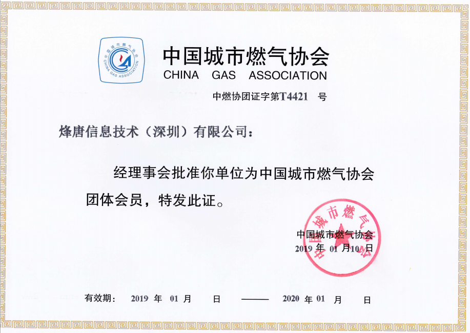 2019年新年伊始,烽唐信息技术(深圳)有限公司通过中国城市燃气协会会员单位资格认证,正式成为中国城市燃气协会会员单位。