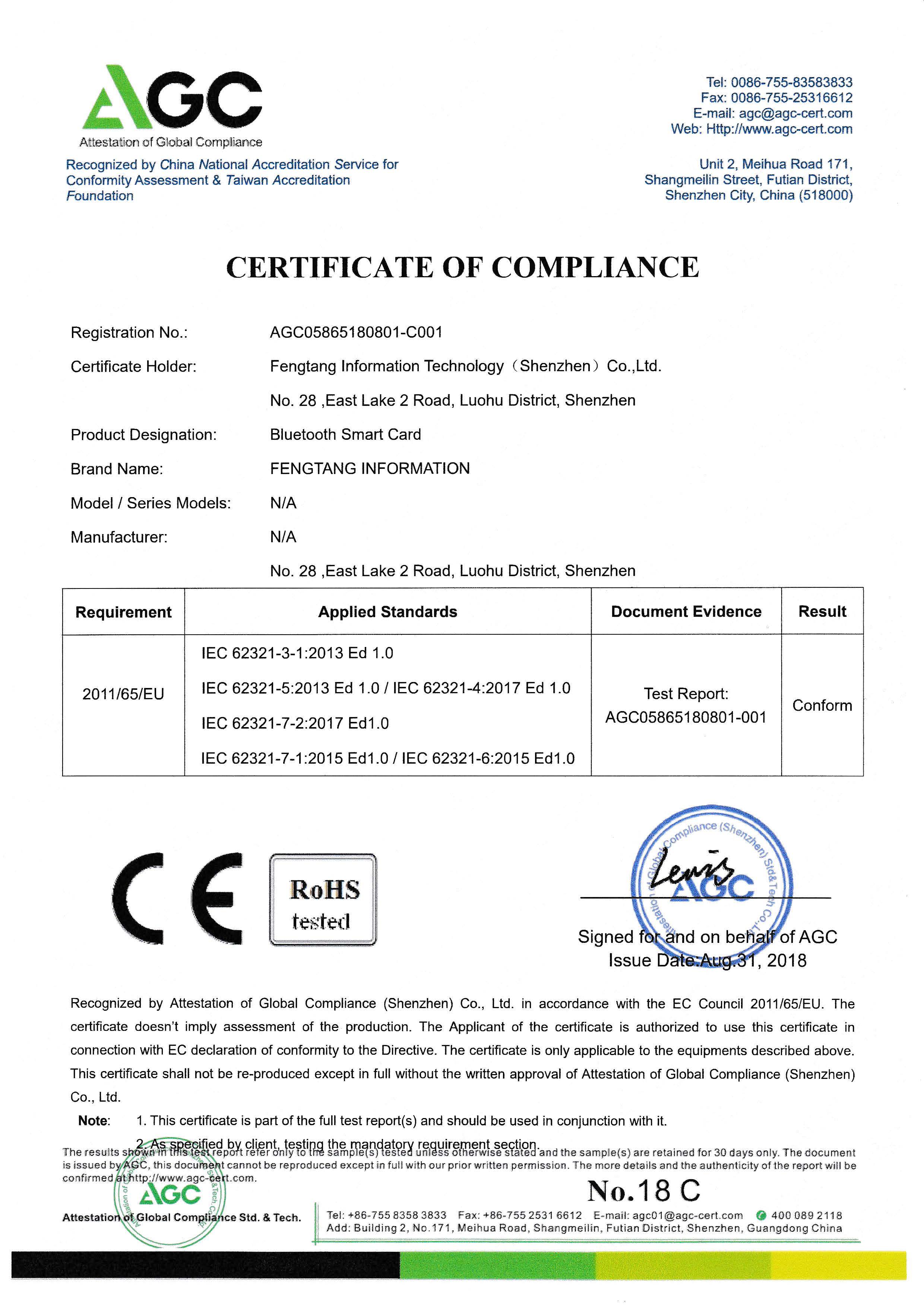 【公司新闻】烽唐蓝牙卡产品通过欧盟RoHS/CE测试认证