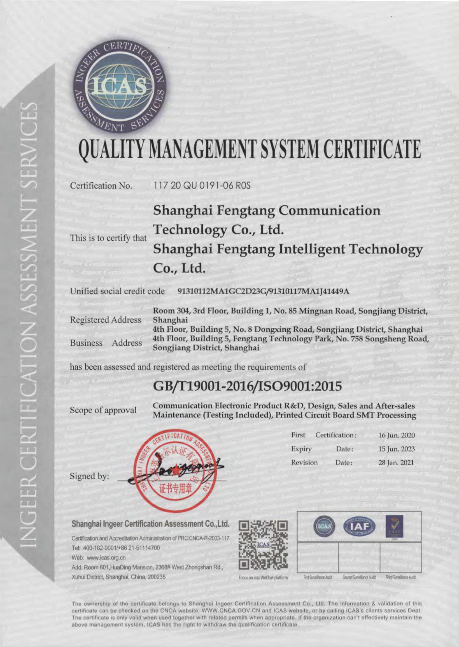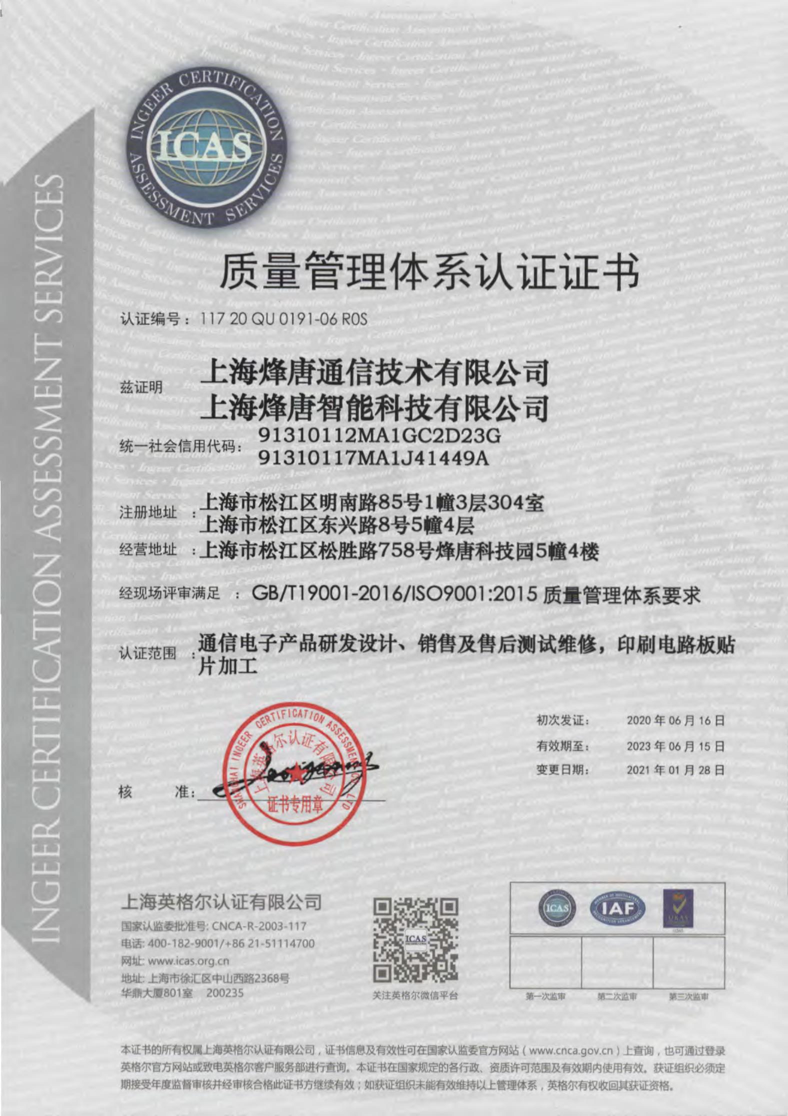 2020年6月16日,上海烽唐通信技术有限公司(简称“烽唐通信”)、上海烽唐智能科技有限公司(简称“烽唐智能”)双双顺利通过ISO9001:2015质量管理体系认证!